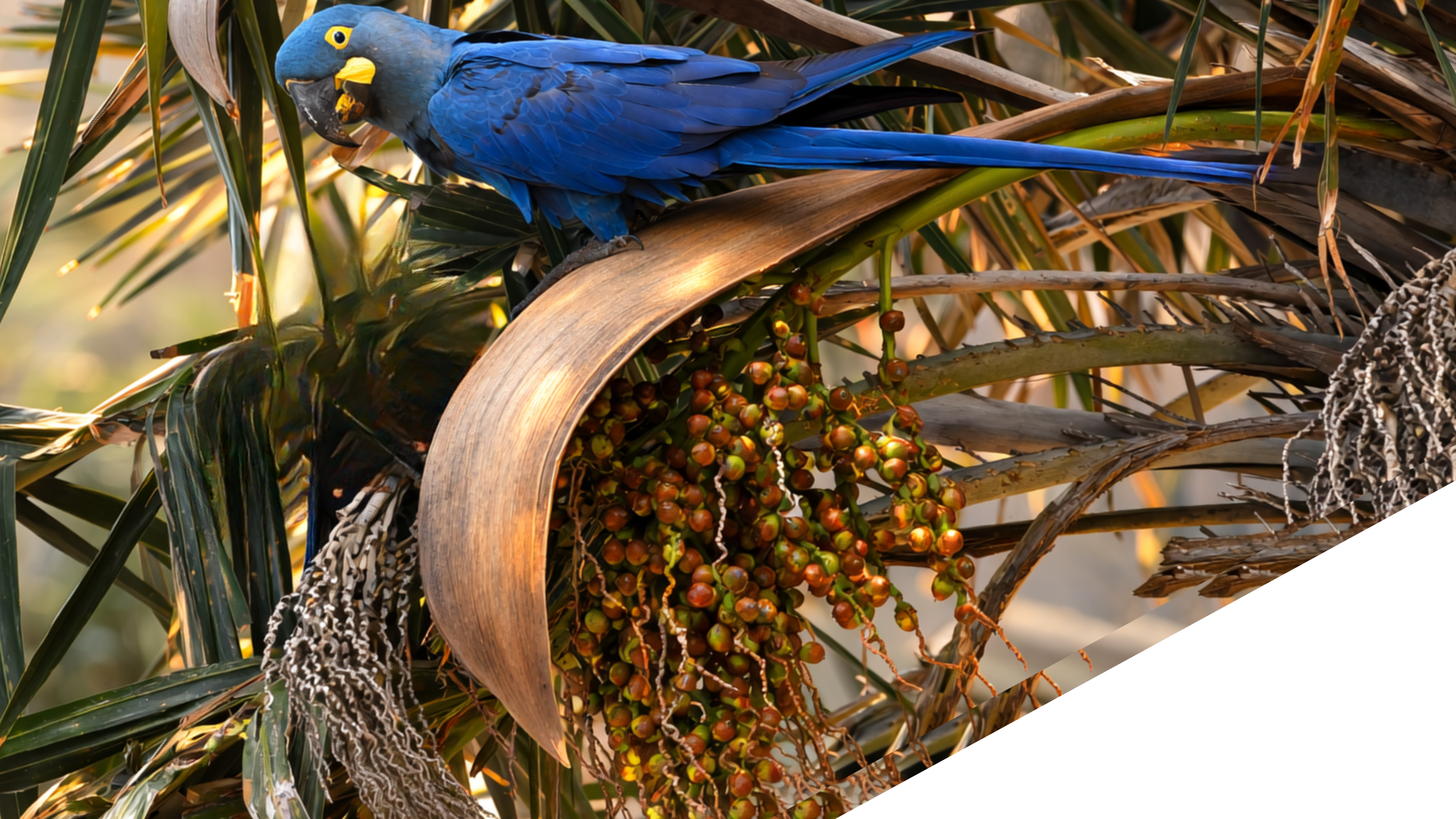 Lear’s Macaw is both granivorous and frugivorous. Its diet is highly specialised and depends almost entirely on the fruits of the licuri palm (Syagrus coronata). This extreme dietary dependence renders the species particularly vulnerable to habitat degradation.